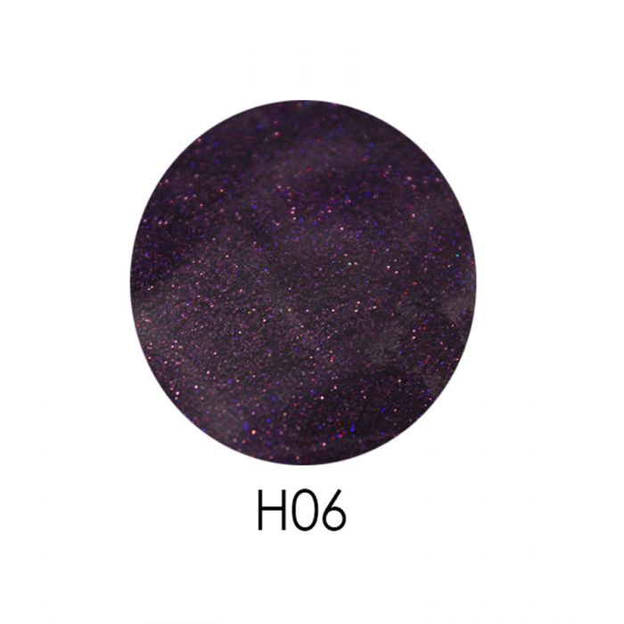 ADORE H06, 2,5 г (темно-фиолетовый, голограмма) – голограммный глиттер для декора маникюра. С его помощью можно создавать оригинальные дизайны или делать однотонное мерцающее покрытие, используя подложку из цветного-гель-лака. Множество металлизированных мелких голографических блесточек переливается, словно радуга, и создают объемный блеск на ногтях.