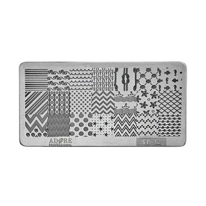 Пластина для стемпінгу Adore Stamping Nail Polish №12 – професійний манікюрний інструмент для створення дизайну манікюру у техніці стемпінгу. На неї наноситься гель або фарба, далі надлишки забираються за допомогою скрапера. Візерунок друкується на штамп і переноситься на ніготь. Такий спосіб дозволяє створити гарний декор без навичок малювання та використання манікюрного пензля. На пластині є різні декори, що дозволяють підібрати потрібний варіант. Матеріал, з якого виготовлено виріб – міцний метал. На нього нанесено гравіювання у вигляді візерунків.